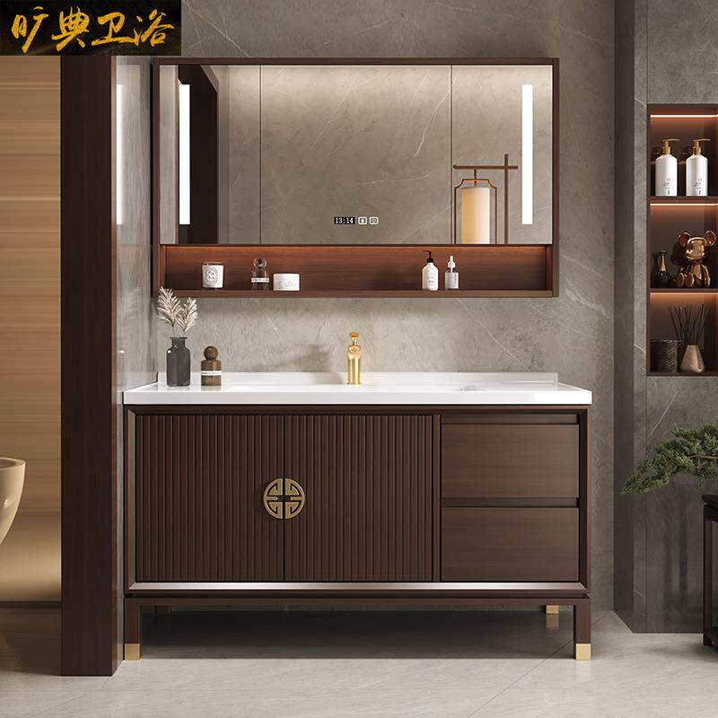 新中式浴室柜橡木智能镜柜一体陶瓷盆实木卫浴柜落地洗脸盆柜组合