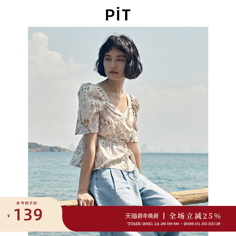 PIT复古碎花褶皱短袖T恤衬衫雪纺衫女2025夏泡泡袖减龄娃娃衫上衣