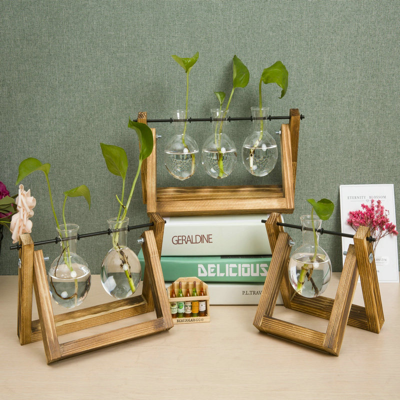 创意木架水培绿萝玻璃花瓶容器盆办公室内桌面绿植现代摆件装饰品