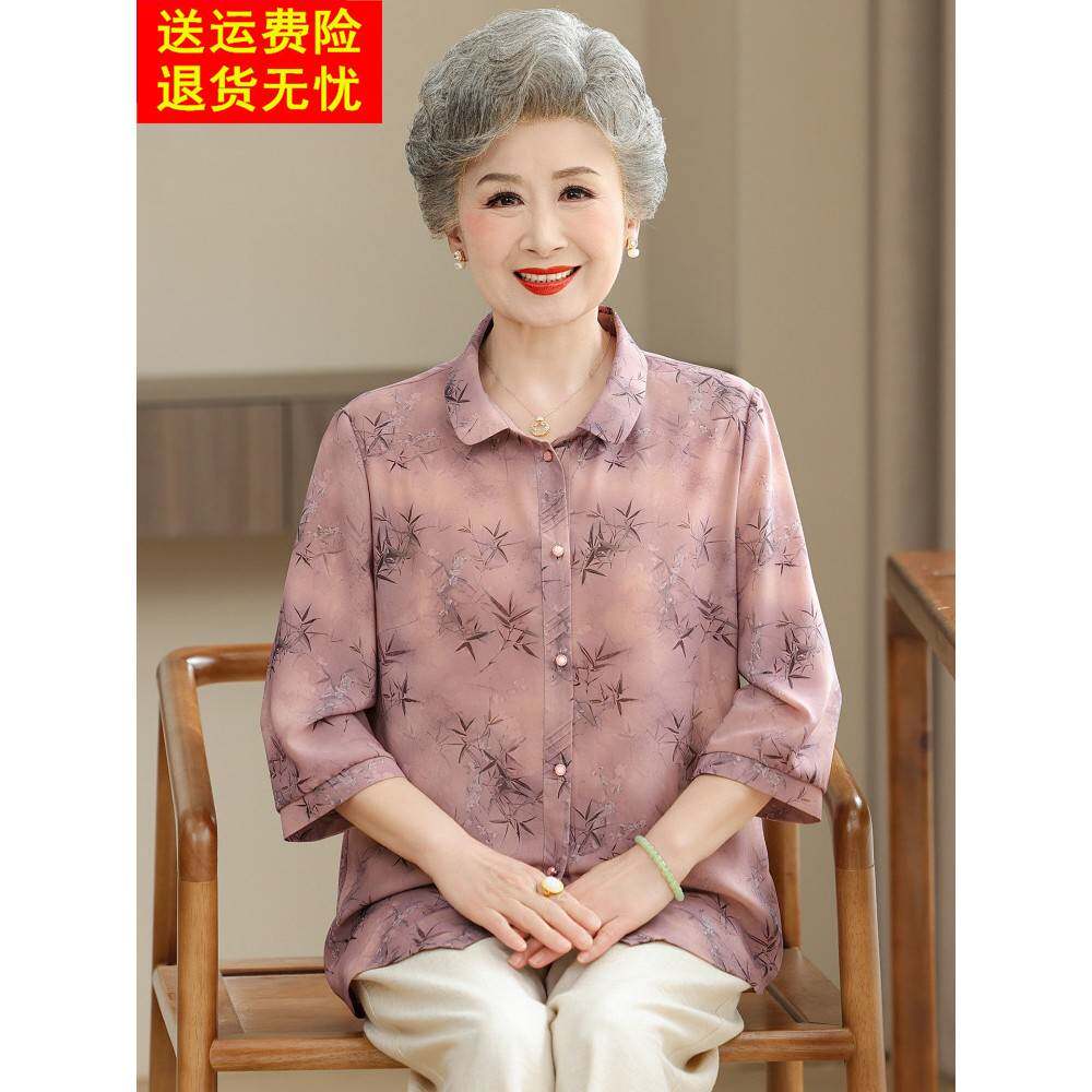 中老年人夏装女真丝绸缎衬衫奶奶套装老人太太衣服妈妈夏季薄衬衣