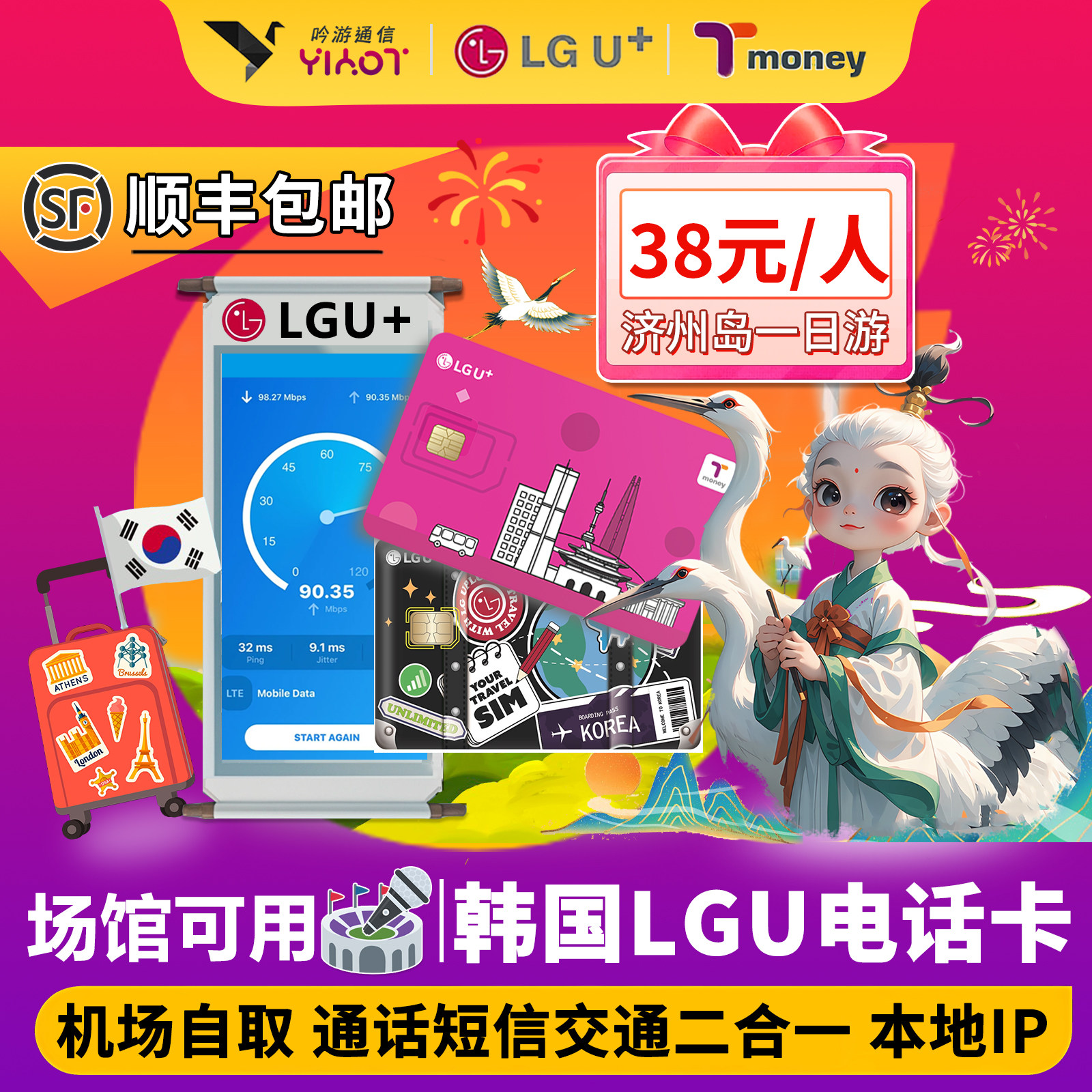 机场自取韩国LGU电话卡高速无限流量上网热点T-money交通卡二合一