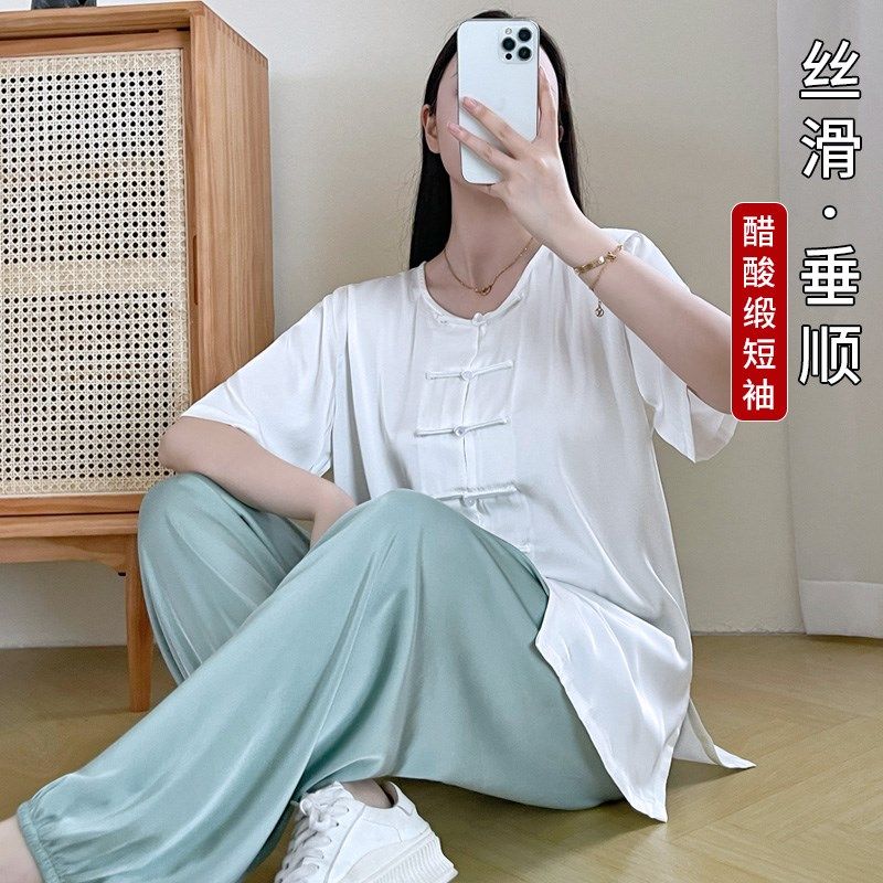 夏季太极服装新款复古中国风男女丝滑垂顺醋酸缎上W衣短袖中式宽