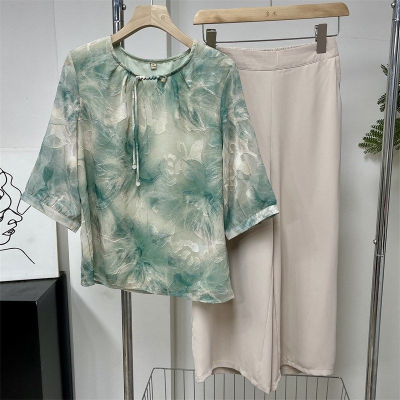 朵莹妈妈夏装新中式小衫时尚套装中老年女装洋气T恤雪纺裤两件套