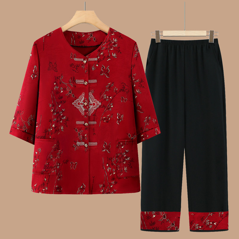 中老年女装妈妈装衬衫两件套夏装奶奶装夏季唐装喜庆套装老人衣服