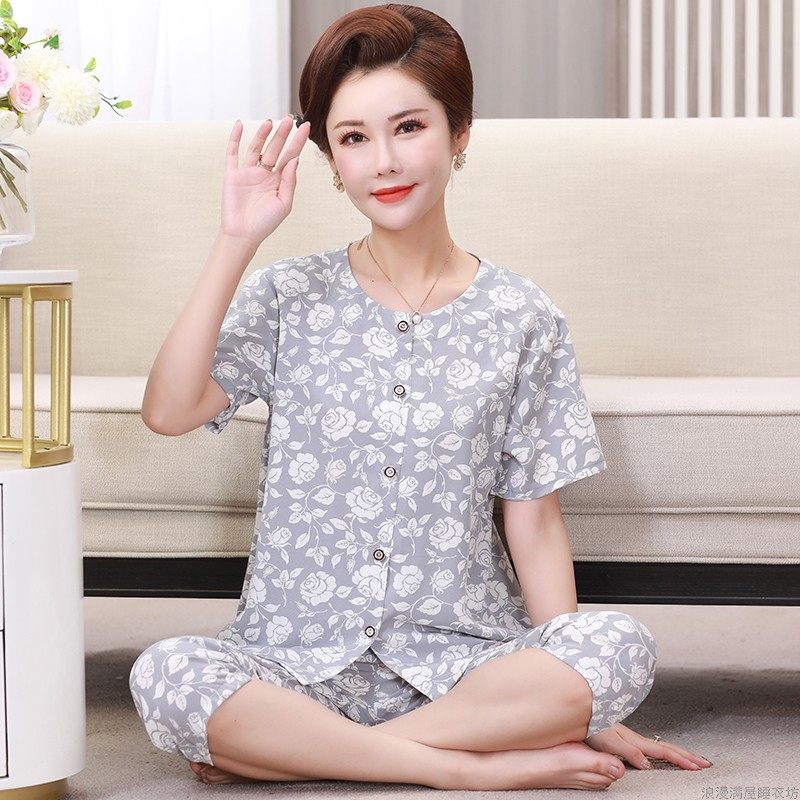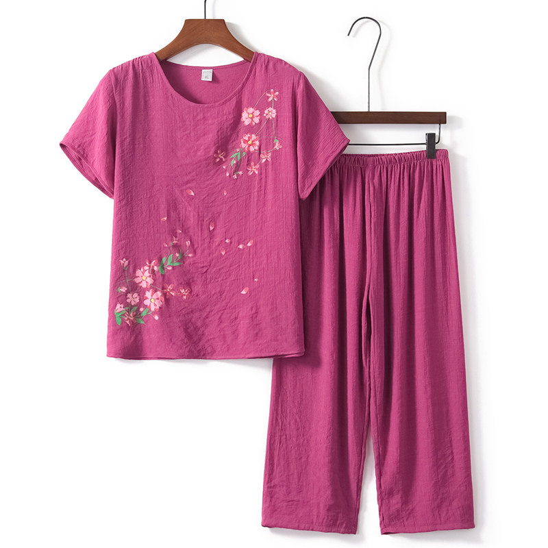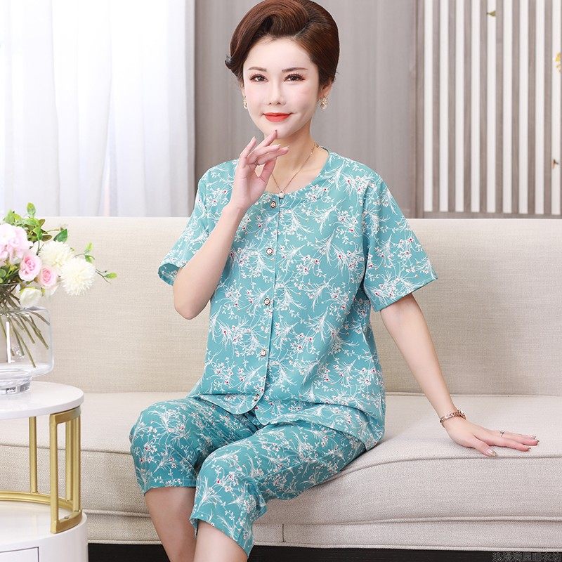 中老年女装妈妈夏装套装老年人短袖上衣奶奶两件套老太太绵绸衣服