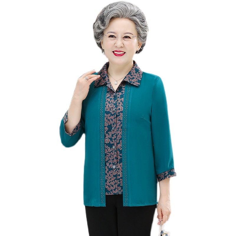 中老年人女装假两件套妈妈夏装长袖衬衫奶奶装夏季大码宽松衬衣服