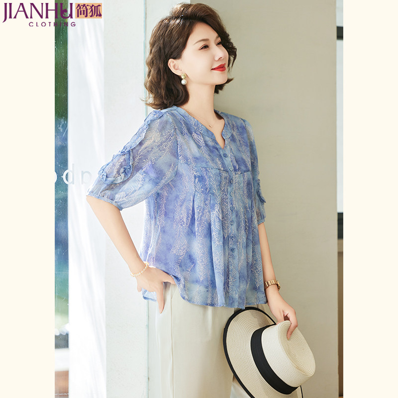 妈妈夏装短袖上衣洋气减龄套装中老年女装雪纺小衫两件套2025新款