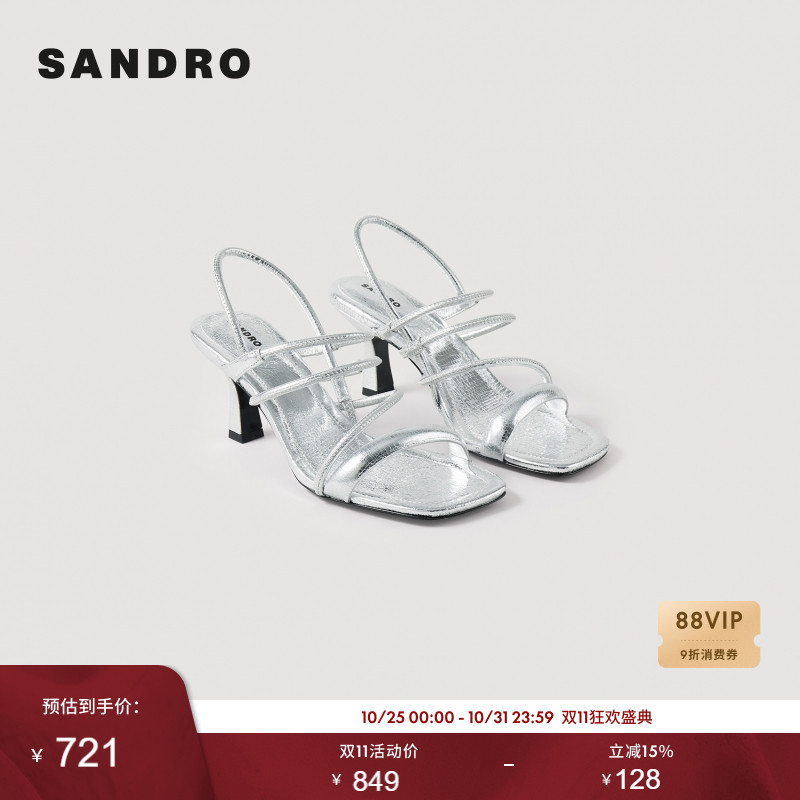 SANDRO Outlets博主同款女士法式气质简约银色交叉细带高跟凉鞋