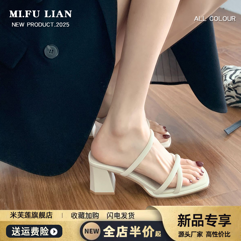 凉鞋女款夏季2025年新款方头百搭细跟小众白色细带夹趾高跟凉拖鞋
