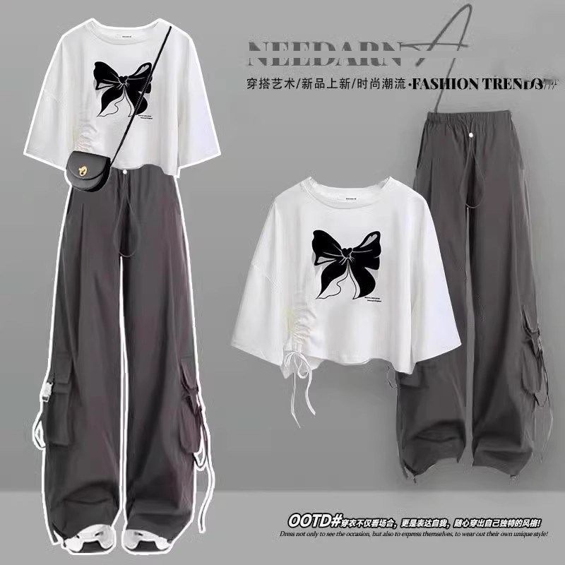 少女大童夏装套装初中学生洋气短袖上衣高腰显瘦工装阔腿裤两件套