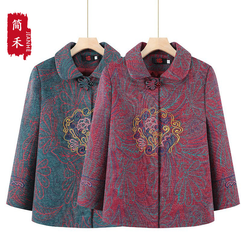老年人女装毛呢外套奶奶春秋绣花上衣老太太衣服妈妈秋冬加绒加厚