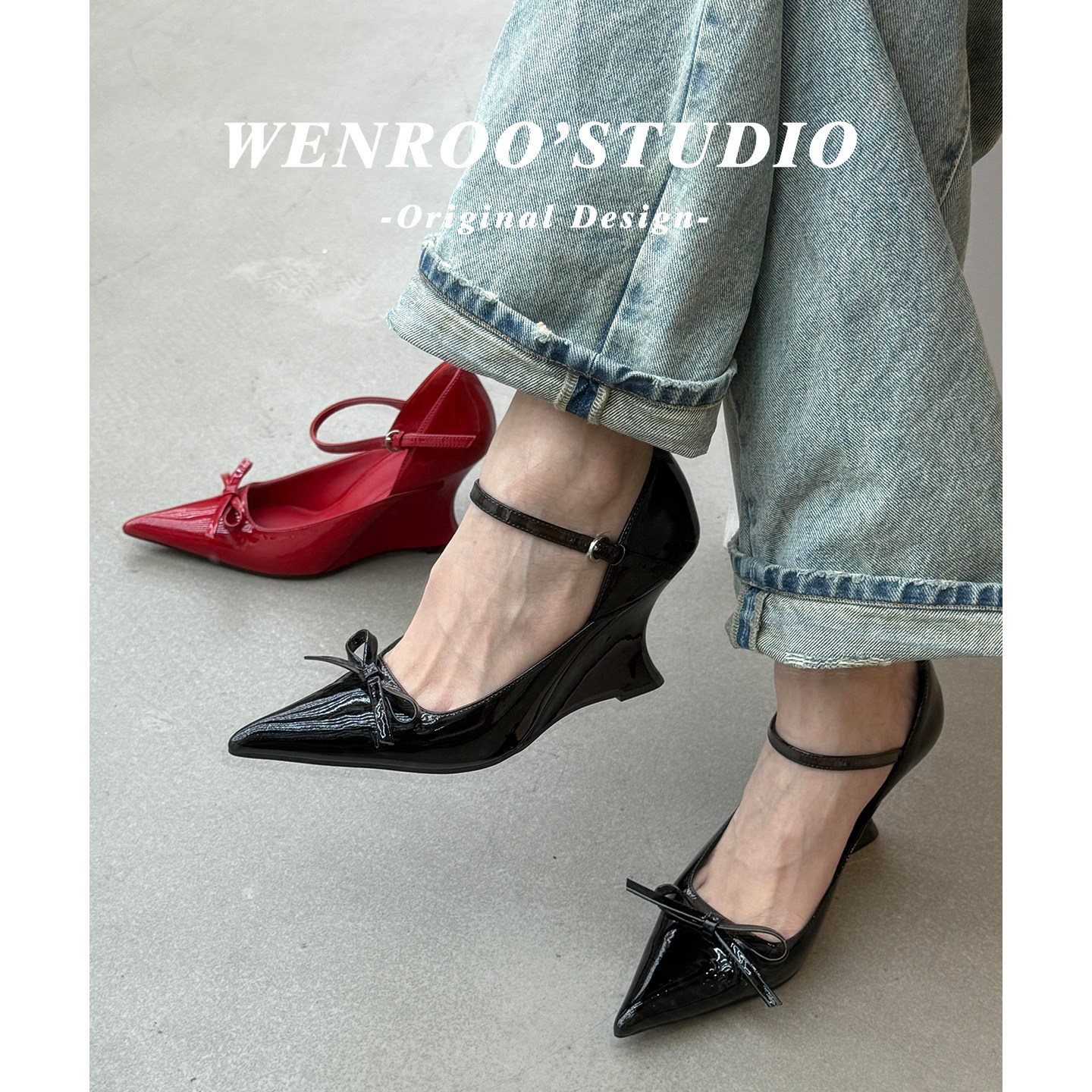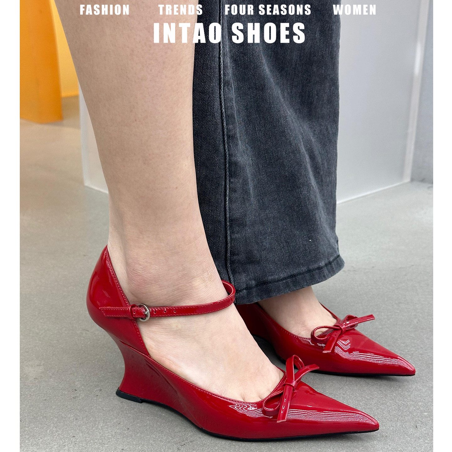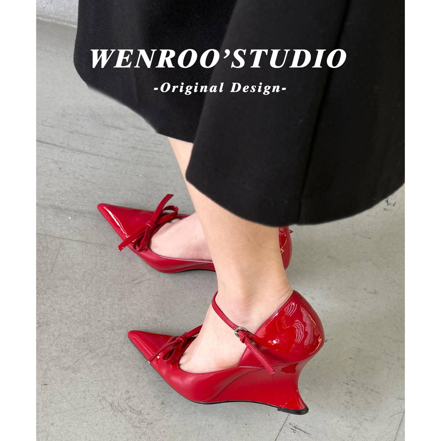 高跟尖头浅口单鞋女坡跟赵露思同款春季走秀款扣带漆皮红色高跟鞋
