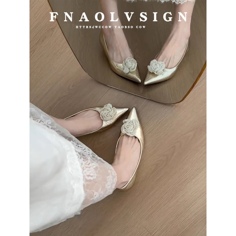 羊皮版~金色婚鞋坡跟不累脚一脚蹬尖头浅口单鞋法式珍珠晚晚鞋女