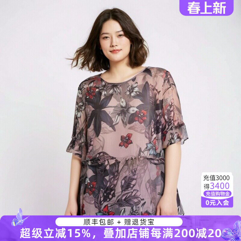 胖太太大码女装夏季新品花色桑蚕丝真丝荷叶袖宽松衬衫422217810