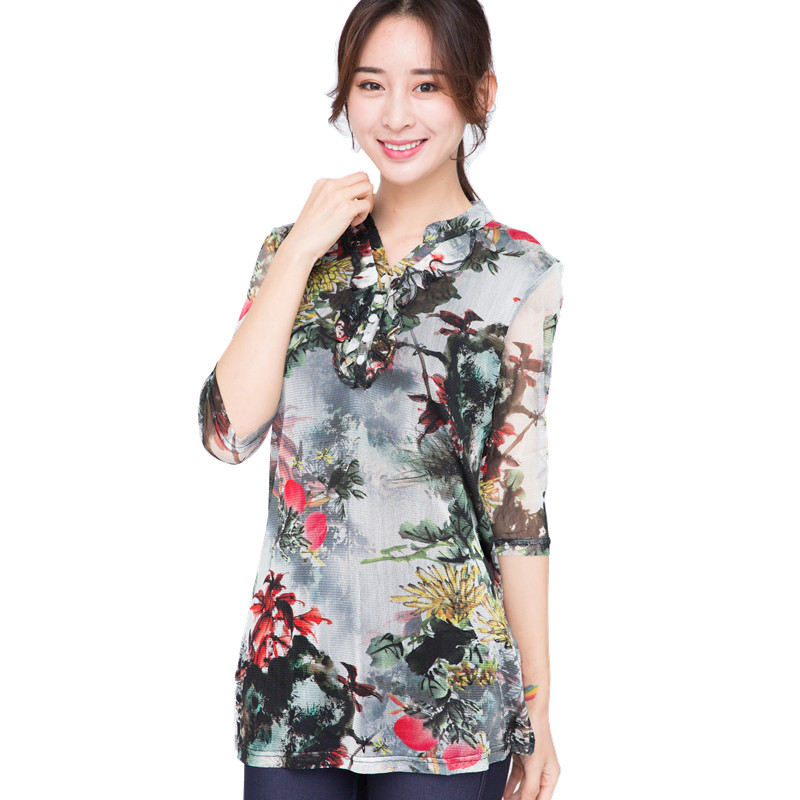 重磅26姆米弹力缎真丝上衣衬衣女 花色大码妈妈装90桑蚕丝t恤衬衫
