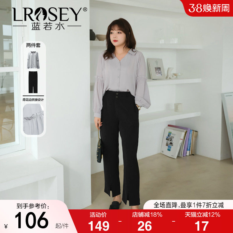 蓝若水大码女装胖MM春装时尚v领雪纺衬衫套装通勤西装长裤两件套