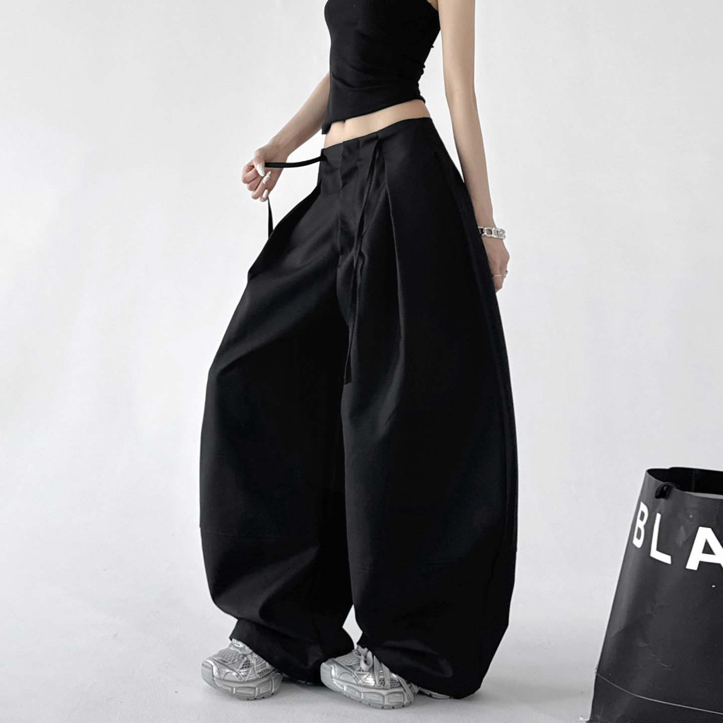 黑色西装裤女春装新款裤子宽松显瘦高腰花苞哈伦裤九分小脚萝卜裤