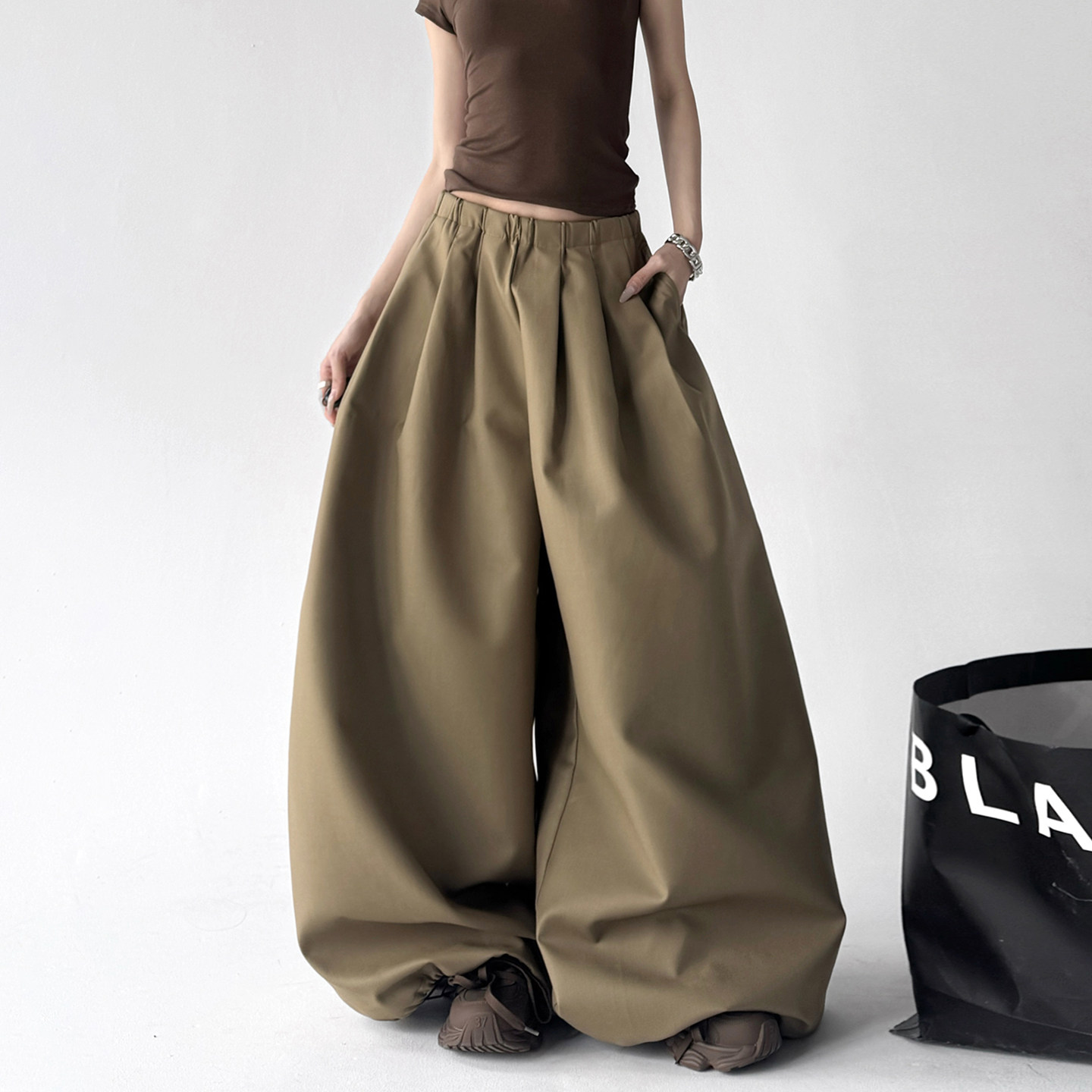 西装款女2026春装新款慵懒风高腰阔腿宽松卡其色垂感休闲长裤子