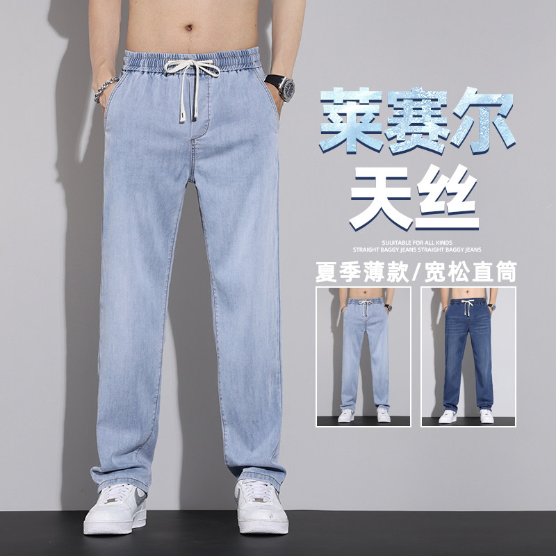 冰丝牛仔裤男夏季新款潮牌宽松莱赛尔天丝裤子男薄款男士直筒长裤