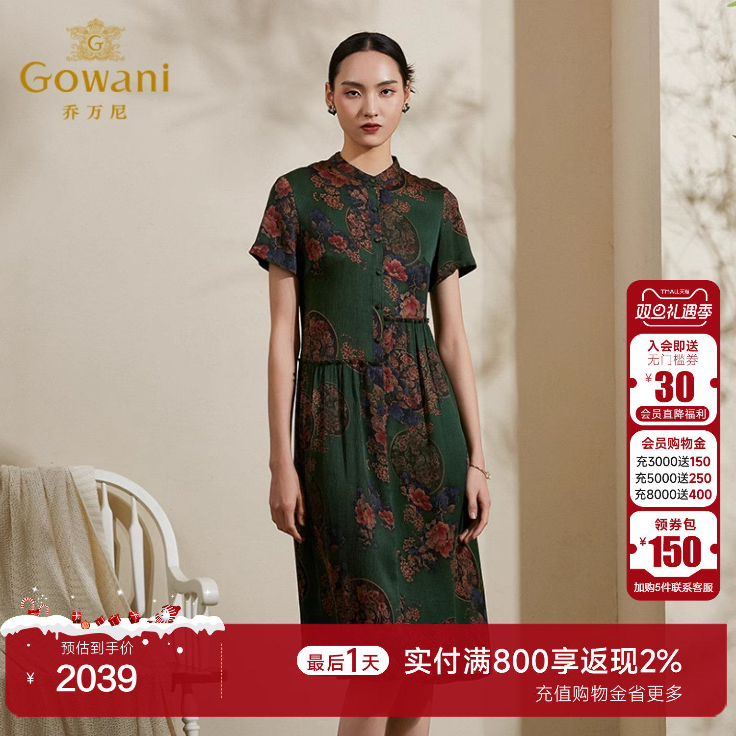 乔万尼香云纱重磅真丝连衣裙商场夏季新品女复古印花桑蚕丝中长裙