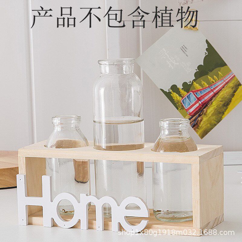 创意木架水培植物玻璃花瓶插花器办公室桌面摆件水培植物花盆器皿