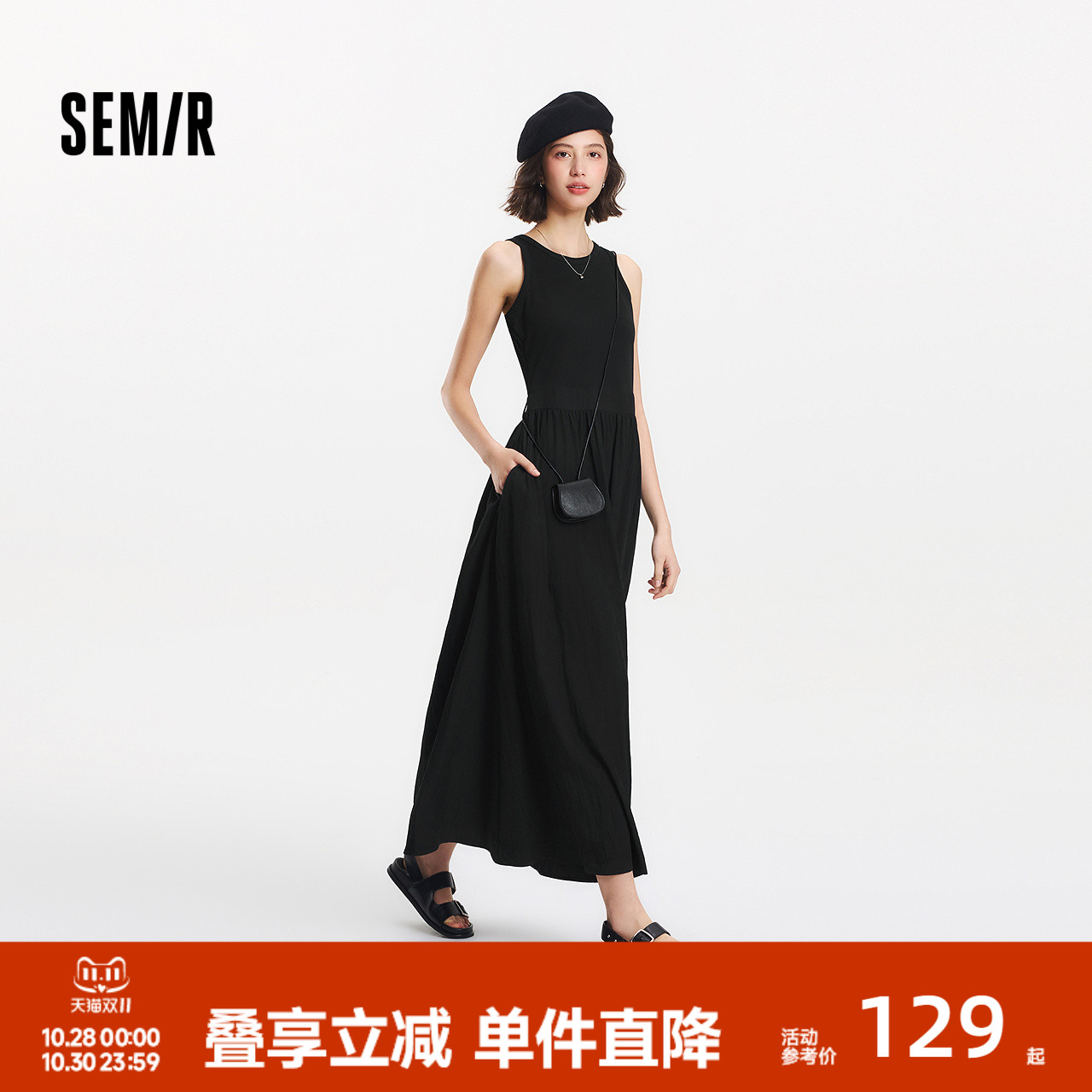 森马连衣裙女纯色无袖长裙休闲温柔时尚2025夏新款收腰背心裙优雅