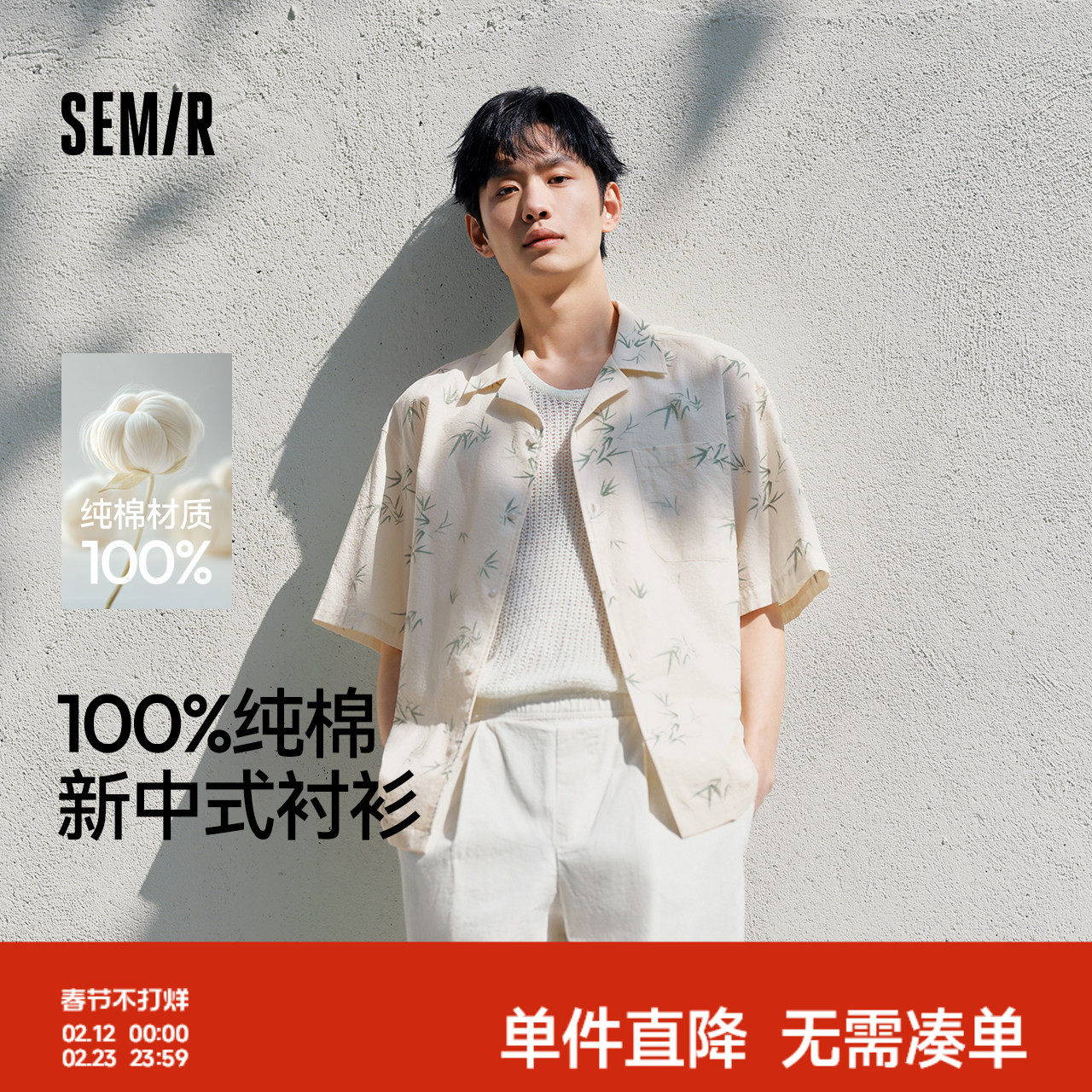 森马短袖衬衫男国风竹叶满印纯棉衬衣2025新款夏装休闲度假上衣潮