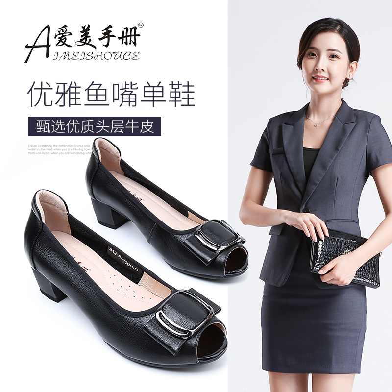 鱼嘴鞋女中跟大码女鞋胖脚宽肥妈妈鞋夏季2025新款真皮单鞋四季鞋