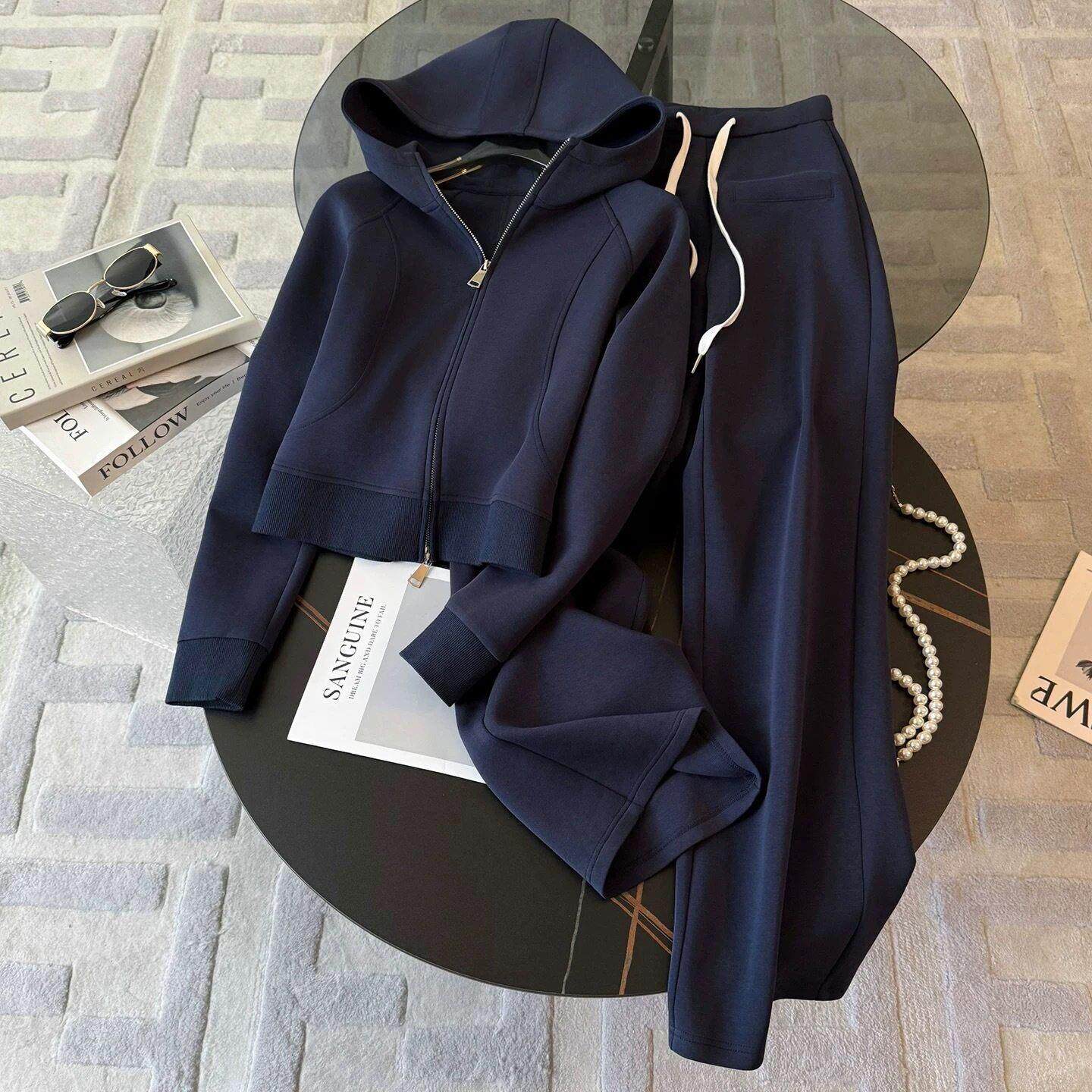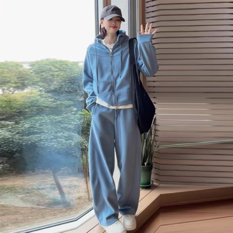 欧洲站休闲运动套装女2025新款春秋韩版蓝色外套卫衣阔腿裤两件套