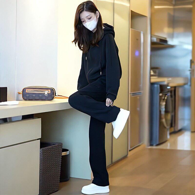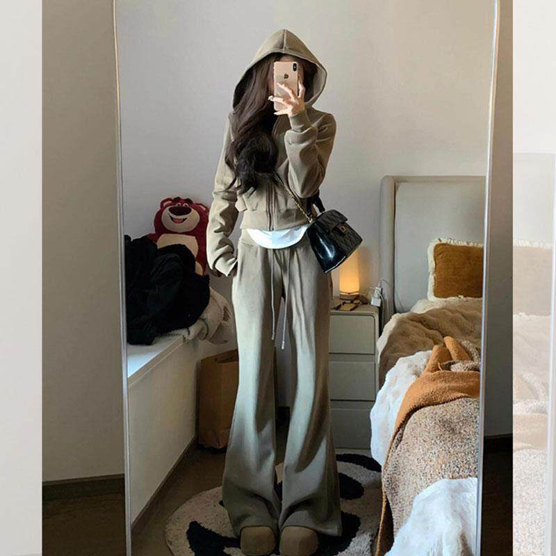 欧洲站时尚休闲套装女2026春秋冬新加厚连帽卫衣阔腿裤两件套