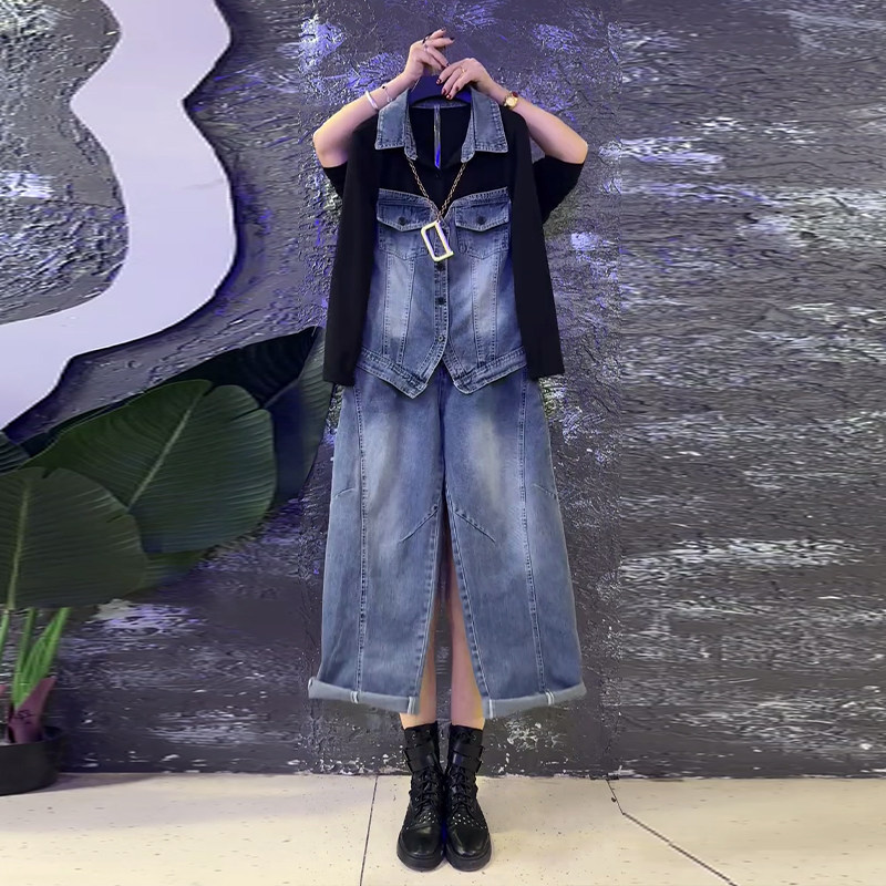 大码女装翻领长袖短款外搭阔腿长裤胖妹妹欧洲站春秋款牛仔两件套