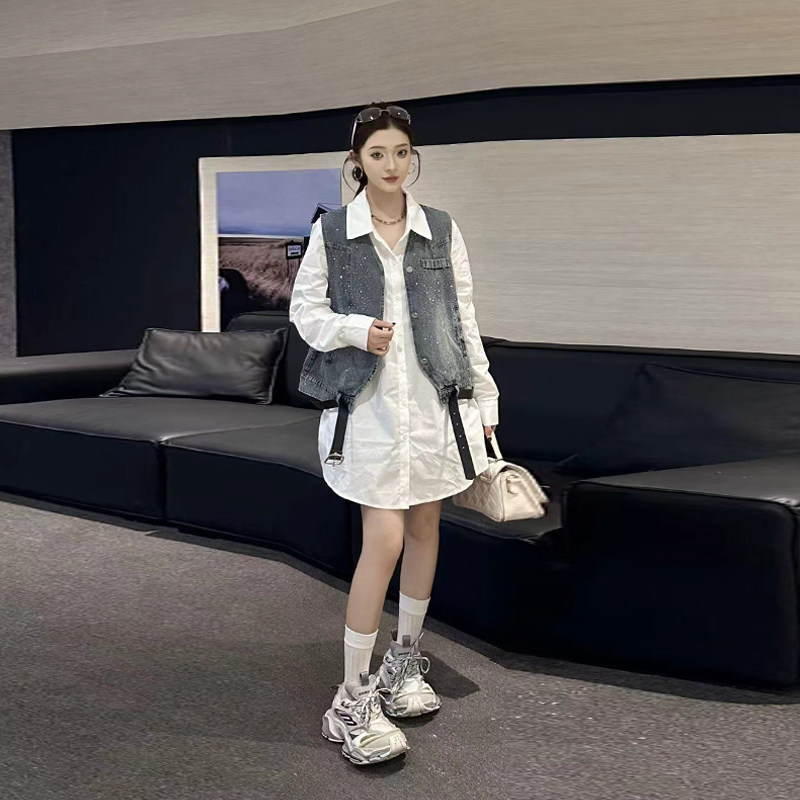 大码女装亮钻牛仔马甲长袖大衫胖妹妹欧洲站时尚减龄春秋款两件套