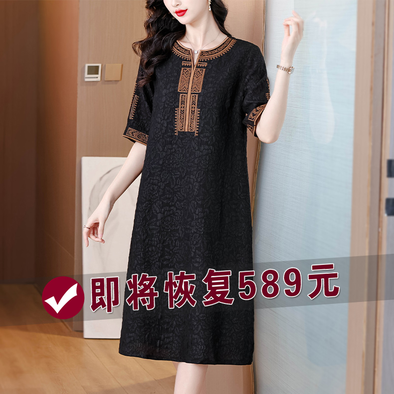 大码香云纱真丝连衣裙2025夏季中年妈妈高贵气质宽松时尚刺绣裙子