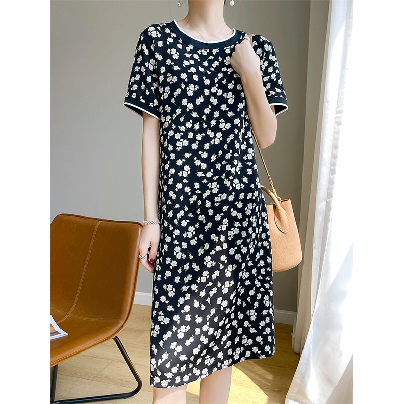 真丝碎花裙连衣裙女气质短袖黑色夏季显瘦缎面新款大码桑蚕丝长裙