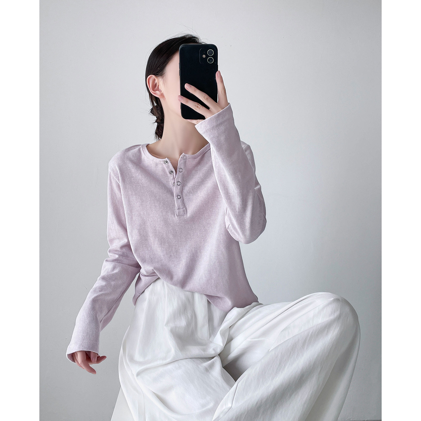 韩版百搭竹节棉圆领纽扣开衫长袖T恤女宽松内搭打底衫上衣24秋季