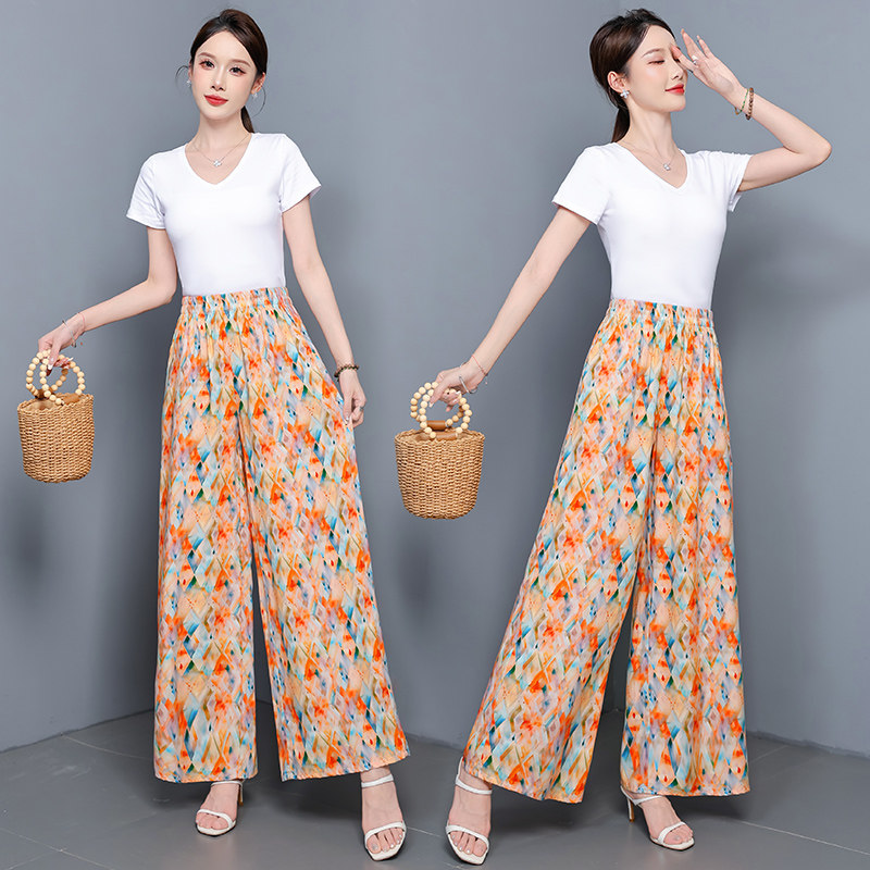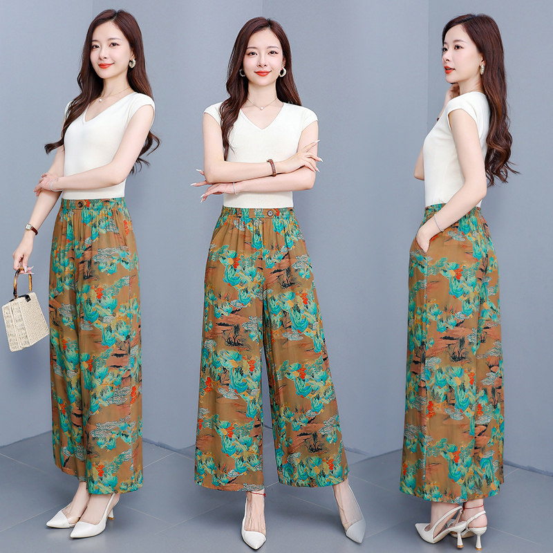 薄款九分阔腿裤女松紧高腰棉绸裙裤中年妈妈减龄时尚大脚裤休闲裤