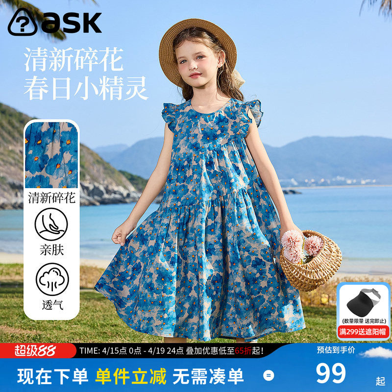 ask儿童裙子2026夏季新品女童清新碎花小女孩中大童蓝色连衣裙