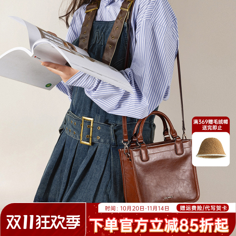 天美意牛皮手提包包女2025新款通勤单肩斜挎包复古油蜡真皮小方包