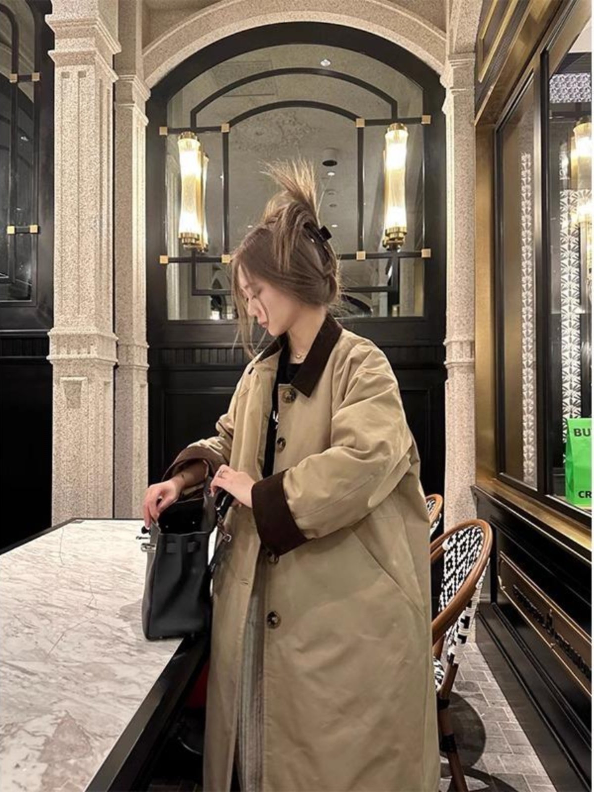 卡其色夹棉风衣女2025夏季新款百搭覆古Polo领宽松显瘦中长款外套