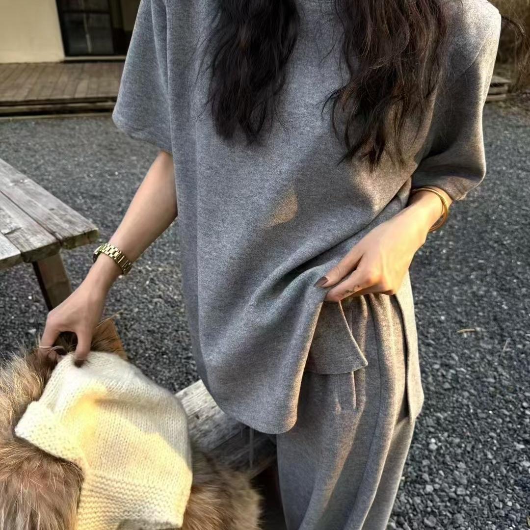 BF冬季宽松百搭时尚羊绒开衩短袖T恤松紧腰阔腿裤纯色休闲套装女