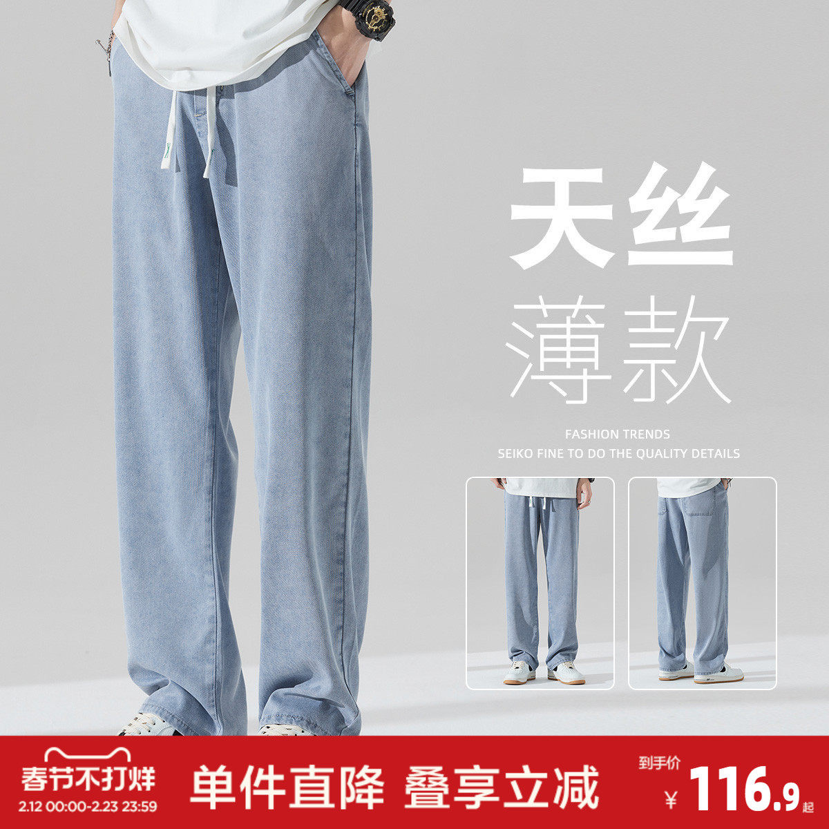 班尼路SK美式复古天丝莱赛尔牛仔裤男夏季薄款直筒裤宽松长裤子YS