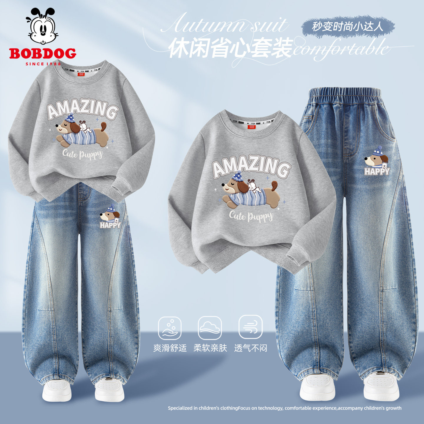 巴布豆童装儿童春秋套装2026新款男童卡通卫衣薄款灰色男孩牛仔裤