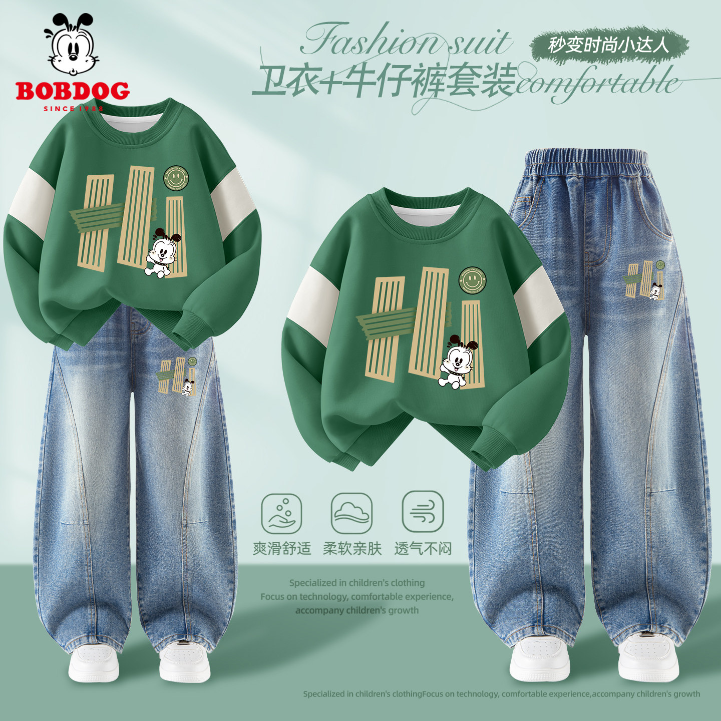 巴布豆男童春秋薄款套装2026新款运动男孩卫衣牛仔裤童装儿童衣服