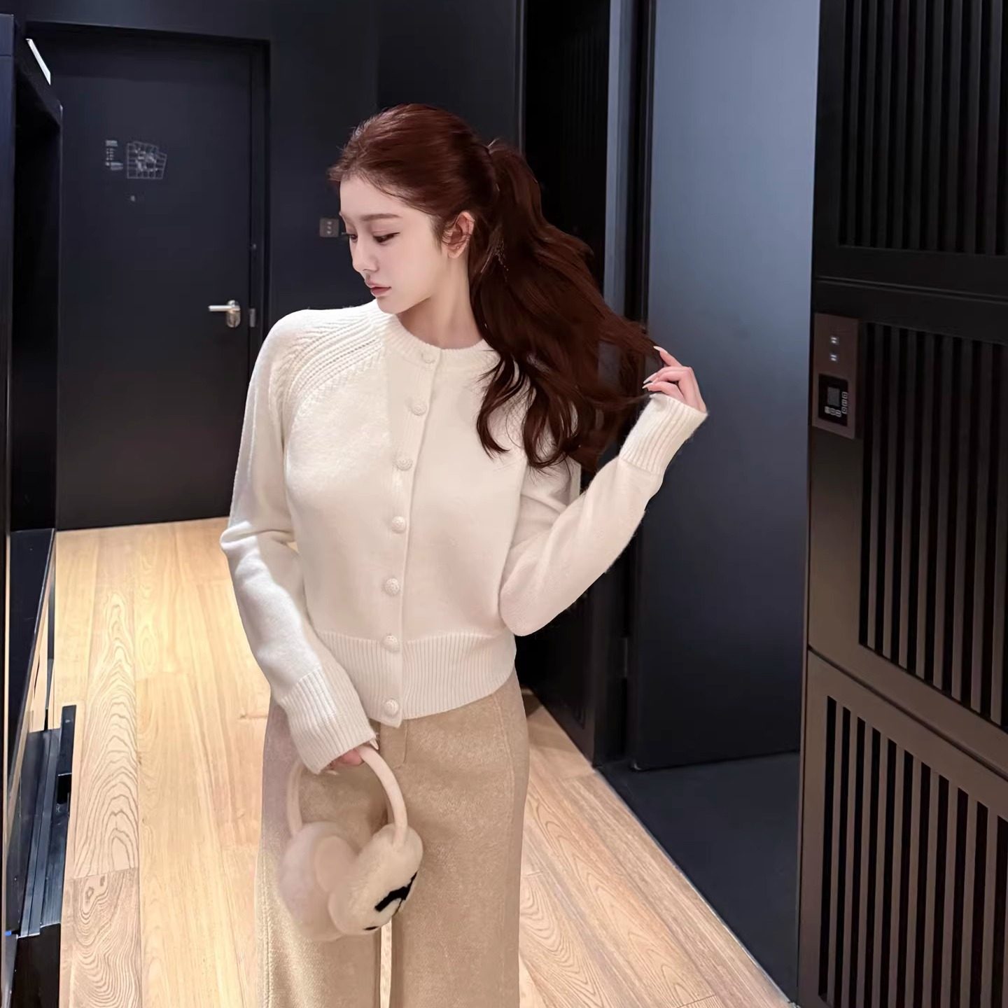 韩雨嘉【纯纯奶白】安哥拉北极绒纱线 白色针织开衫女冬圆领毛衣