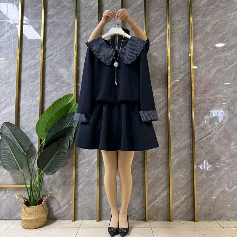 胖妹妹大码女装格纹拼接娃娃领上衣短裙套装春季新款休闲显瘦套裙