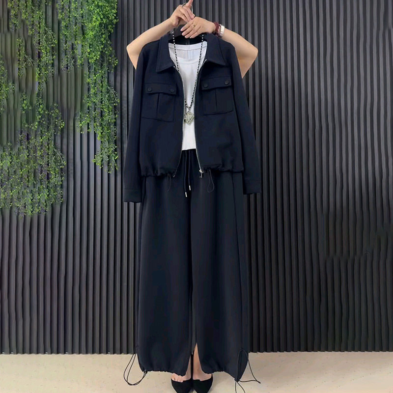 早春新款休闲双兜款拉链工装外套抽绳裤子显瘦套装胖妹妹大码女装