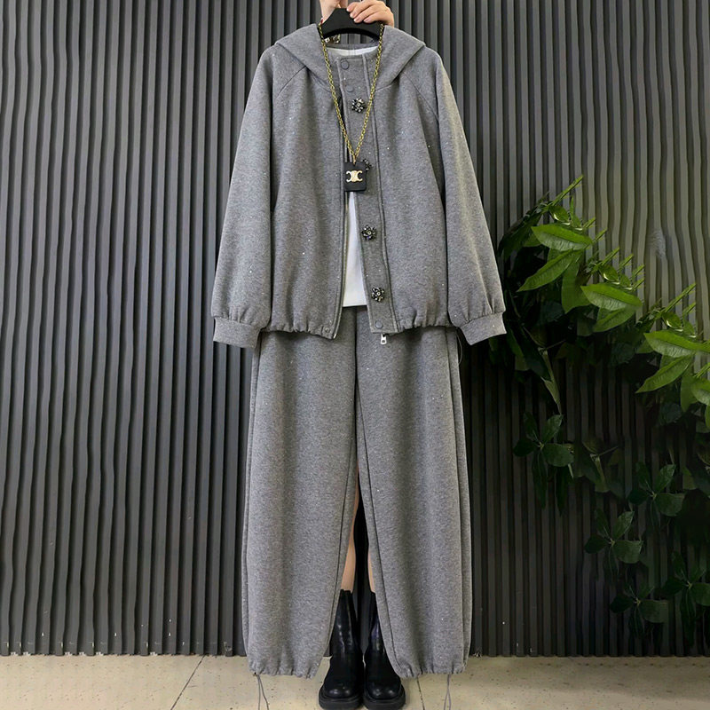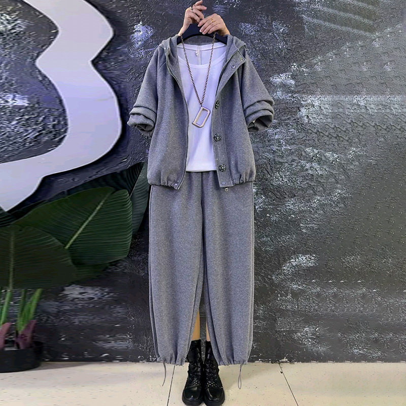 早春新款欧货轻奢连帽开衫外套抽绳裤子休闲套装胖妹妹大码女装潮