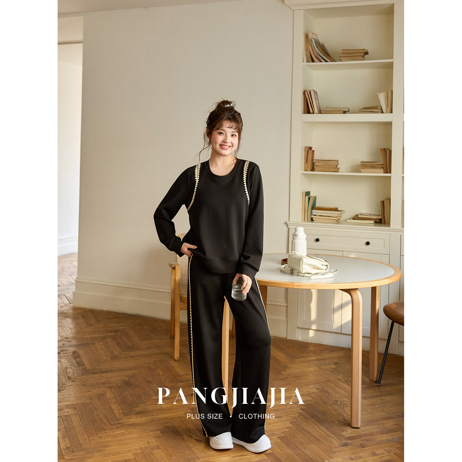 【胖佳佳】胖妹妹mm大码女装臻享黑巧套装春季卫衣休闲裤两件套