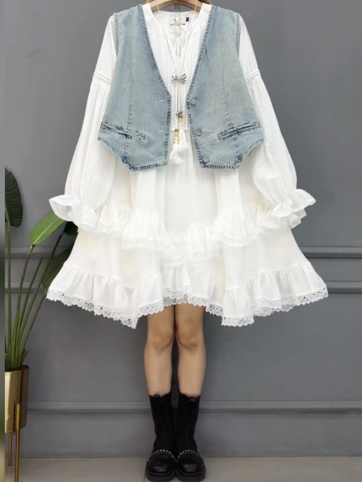 早春大码韩版宽松牛仔马甲蕾丝边连衣裙两件套减龄胖妹妹休闲套装