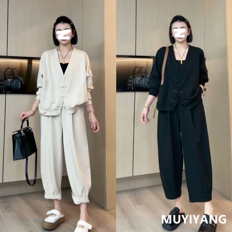 国风盘扣蝙蝠袖开衫灯笼裤两件套2025秋季新款大码胖妹妹休闲套装